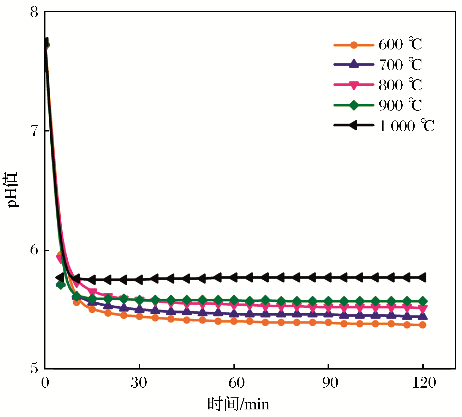 | 图3 不同温度下SO2吸收液酸度随焙烧时间的变化 |