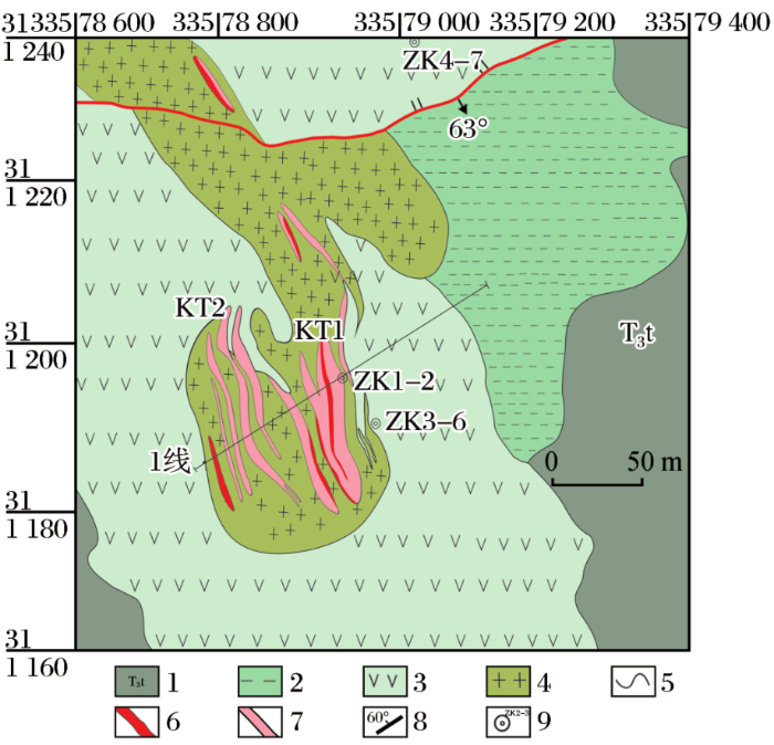 ... 矿区出露地层为上三叠统图姆沟组二段一亚段,岩性主要为蚀变安山岩和蚀变安山质凝灰岩,总体上属于火山岩系—碎屑岩建造.矿区内断裂发育,NW向断裂规模较大,与主构造线方向一致,还发育有近EW向次级张裂隙.NW向断裂切穿矿体,构造活动使区内岩体出现强烈的片理化(