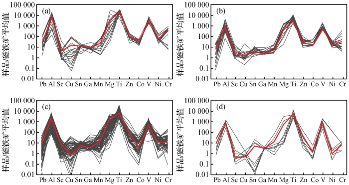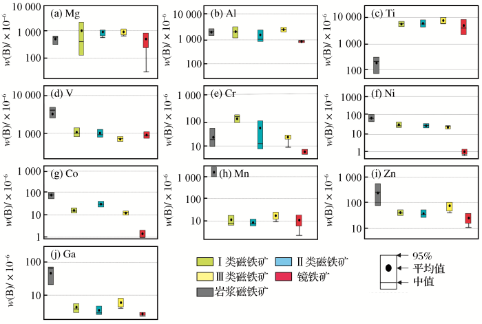 ... 此外,镜铁矿作为高氧逸度指示矿物也出现在成矿晚期.成矿晚期的镜铁矿产于白云石+石英+石膏脉体中,与磁铁矿并不共生.与3类磁铁矿相比,镜铁矿中的二价元素Co、Ni和Cr含量显著降低,发生了数量级变化.Mn和Mg元素虽然在平均含量上与磁铁矿相差不大,但是在镜铁矿中部分样品的Mn和Mg元素含量低于检测限(表2 ).而在镜铁矿中以三价离子存在的Al、Ti和V元素含量与磁铁矿并没有差别.这种现象可能是由于二价离子和镜铁矿所需离子的原子价态与半径不一致所导致的[15 ] . ...