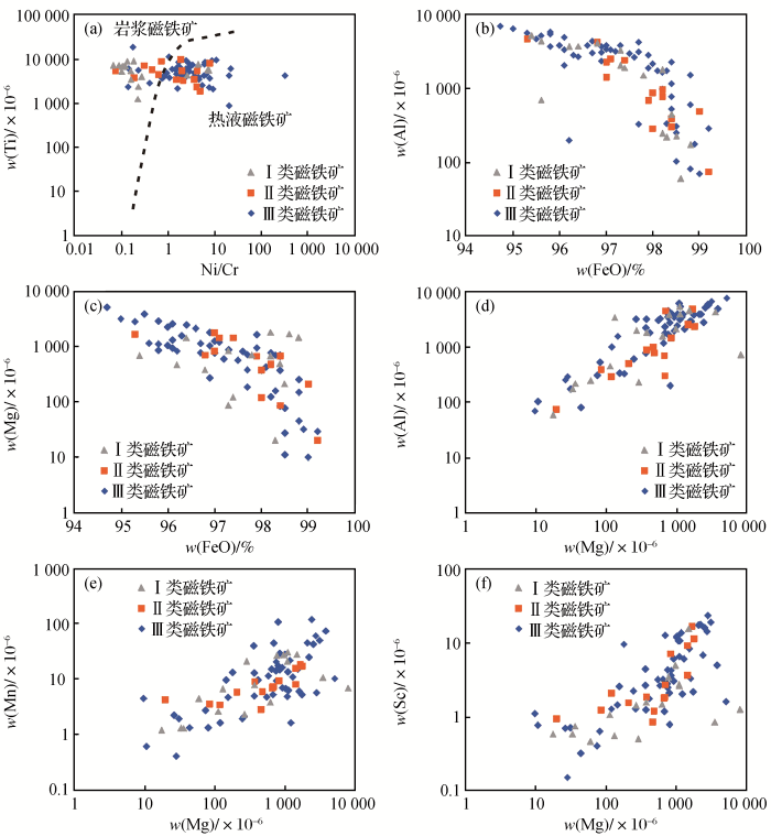 ... [10 ]提出的Ni/(Cr+Mn)-(Ti+V)判别图,可以区分不同成矿环境下产生的磁铁矿(如钒钛磁铁矿矿床、斑岩—矽卡岩矿床、Kiruna型铁矿床、铁氧化物铜金矿床和条带型铁矿等).然而,后期流体蚀变作用的叠加以及氧逸度、温度等外界因素的改变,会使原生磁铁矿结构和微量元素含量发生变化,从而导致上述判别图解不够准确.胡浩等[12 ,13 ] 和Wen等[14 ] 对磁铁矿岩相学和微量元素进行研究发现,岩浆磁铁矿在流体交代作用下会发生溶解—再沉淀现象,使得磁铁矿结构和微量元素含量发生改变(Ti、Al、Mg、Cr、Mn和Zn等元素亏损,Fe元素富集).同时,原生磁铁矿氧化成为磁赤铁矿或镜铁矿的过程中,由于原子价态与半径不一致会降低二价阳离子在磁铁矿中的含量[15 ] .因此,对磁铁矿结构和微量元素进行深入研究,不仅可以明确磁铁矿经历的后期改造作用,而且能够进一步鉴定上述判别图解的适用性. ...