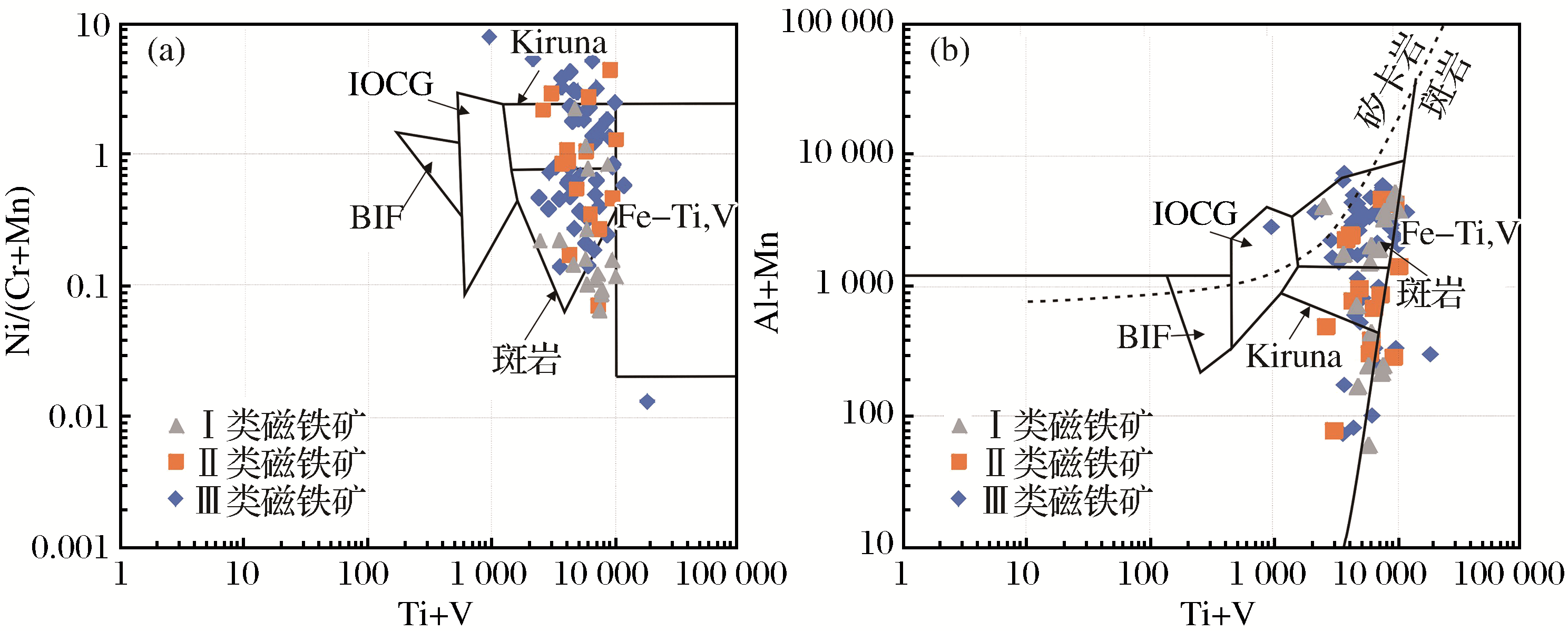 | Fig.11 Discrimination diagram of magnetite genesis in Lannitang porphyry Cu-Au deposit[ (a)(Ti+V)-Ni/(Cr+Mn);(b)(Ti+V)-(Al+Mn) |
