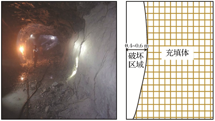 山东黄金集团焦家金矿在应用上向水平进路充填采矿法进行开采的过程中,采用挤压爆破的方式挤压充填体来获得爆破补偿空间,避免了掏槽眼施工,提高了开采效率。但由于爆破对于充填体的挤压作用,极易造成充填体大面积垮落(破坏深度为0.4~0.6 m,图1),同时由于充填体混入矿石中造成矿石贫化,显著增加了选矿成本。因此,为了确定合理的孔边距和爆破时间,基于Mises屈服准则来确定充填体破坏阈值,采用LS-DYNA软件研究了不同爆破条件下的充填体破坏范围,着重分析了炮孔距充填体距离和充填体养护龄期对充填破坏范围的影响。