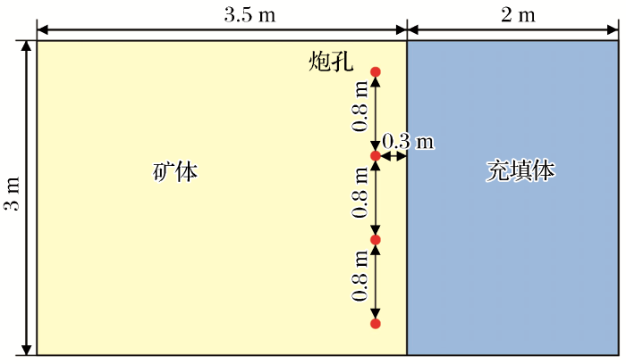 本研究采用的计算模拟为二维平面模型。模型尺寸为5.50 m×3.00 m×0.02 m(宽×高×厚),其中矿体模型尺寸为3.5 m×3.0 m(宽×高),充填体模型尺寸为2 m×3 m(宽×高)。在矿体中布置一排共4个炮孔,孔距为0.8 m,炮孔直径为42 mm,如图2所示。模型共计单元数为18 214个,其中炸药单元数为432个,矿体单元数为8 582个,充填体单元数为9 200个,炸药与矿体之间采用共用节点算法进行计算。模型为无限大矿体的一部分,四周设置透射边界条件,前后施加零位移约束。装药方式采用耦合装药,在炸药中心单点起爆,4个炮孔同时起爆。采用LS-PREPOST后处理软件进行爆破结果分析,包括有效应力云图及不同位置的单元有效应力时程曲线。所有模拟的数值单位均采用m-kg-s,应力单位采用Pa。