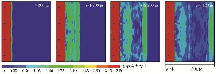 (1)爆破过程中的有效应力分析。图3所示为孔边距为0.3 m时有效应力在充填体内的传播过程。从图中可以看出:在爆破起爆后的200 μs时,应力波到达充填体与矿体接触面(简称“充—矿接触面”)。此时,充—矿接触面与炮孔在同一高度区域处的有效应力相对较大。当t=1 200 μs时,应力波到达充填体的1/4处,有效应力波峰值有所减小;当t=3 120 μs时,应力波峰值到达充填体边界,此时应力波衰减至一个较小的值,之后会从边界透射出去。应力波在充填体中随着时间的增加,其波峰缓慢向前传播,从云图上可以看出应力波峰值不断衰减。由上述分析可知,基于DYNA的数值模拟研究可以清晰地反映爆破后充填体内的应力传播规律和衰减特征,从而为充填体破坏范围分析提供应力数据。