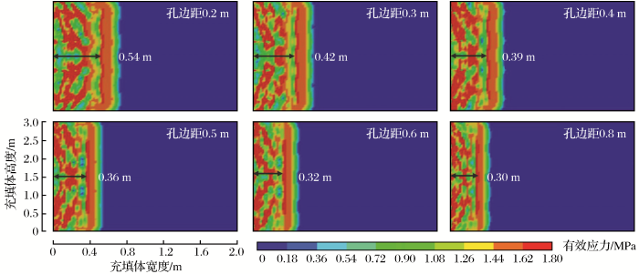 (1)不同炮孔边距的模拟方案:为了研究不同炮孔边距起爆时爆破对充填体破坏程度的影响,考虑单侧有充填体(养护龄期为28 d)的情况,开展了不同炮孔边距条件下的数值模拟研究,炮孔距充填体的距离分别为0.2,0.3,0.4,0.5,0.6,0.8 m共6种情况。
