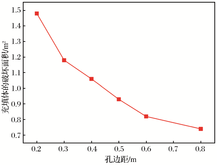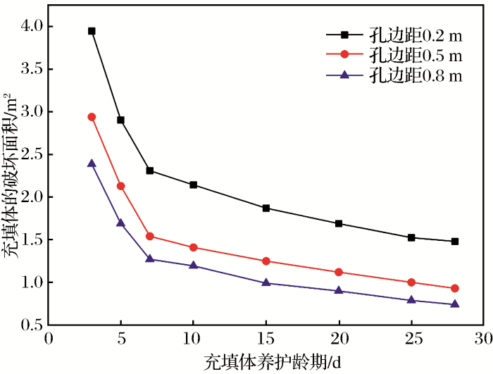 由于不同养护龄期充填体的动态抗拉强度不同,根据破坏准则,将不同模拟方案的Mises有效应力峰值与各养护龄期对应的充填体动态抗拉强度进行对比分析,作为充填体破坏的发生条件,得到不同养护龄期充填体的破坏规律如图7和图8所示。以0.5 m孔边距为例:当充填体养护3,5,7,10,15,20,25,28 d时,充填体的破坏面积分别为2.94,2.13,1.54,1.41,1.25,1.12,1.00,0.93 m2。当充填体养护龄期由3 d增加至7 d时,充填体的破坏范围显著减小,充填体养护3 d时,爆破引起的充填体的破坏深度为1.16 m,其破坏面积约为充填体养护7 d时的2倍。当充填体养护超过7 d后,其破坏面积变化较小(图8)。当孔边距为0.2 m和0.8 m时,充填体破坏面积的变化趋势与孔边距为0.5 m时相近。考虑焦家金矿的实际生产情况,建议在充填体养护7 d后开展爆破施工作业。