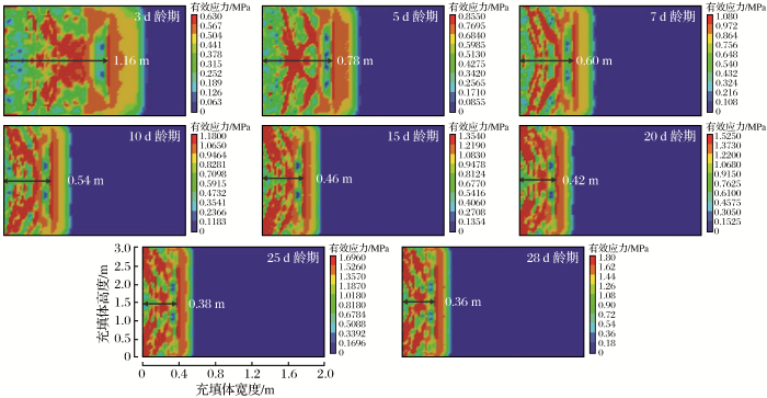 (2)不同充填体养护龄期模拟方案:分析了充填后3,5,7,10,15,20,25,28 d养护龄期条件下,爆破对充填体破坏程度的影响。