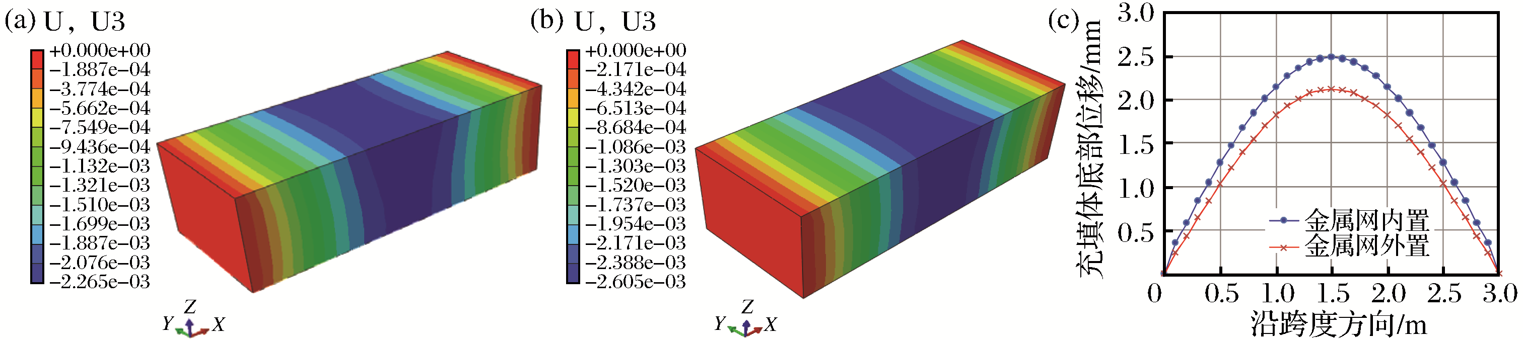 | Fig.7 The z-direction displacement contour of scheme 1(a),scheme 2(b) and the z-direction displacement at bottom of the artificial false bottom(c) |