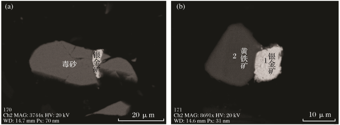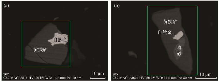 (a)矿石中的自然金与黄铁矿紧密连生;(b)矿石中与毒砂连生的自然金被黄铁矿包裹