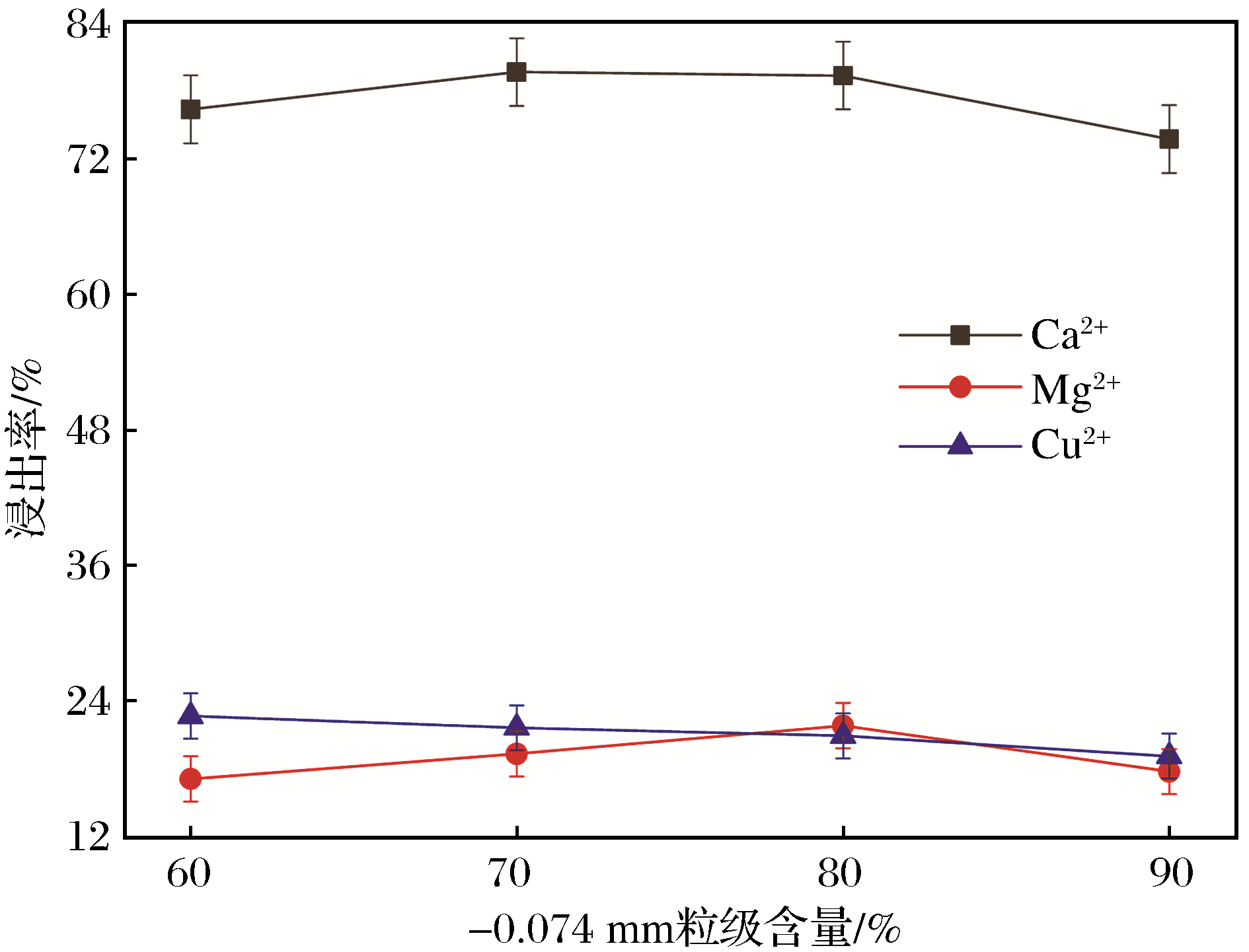| 图3 粒度对Ca2+、Mg2+和Cu2+浸出效果的影响 |