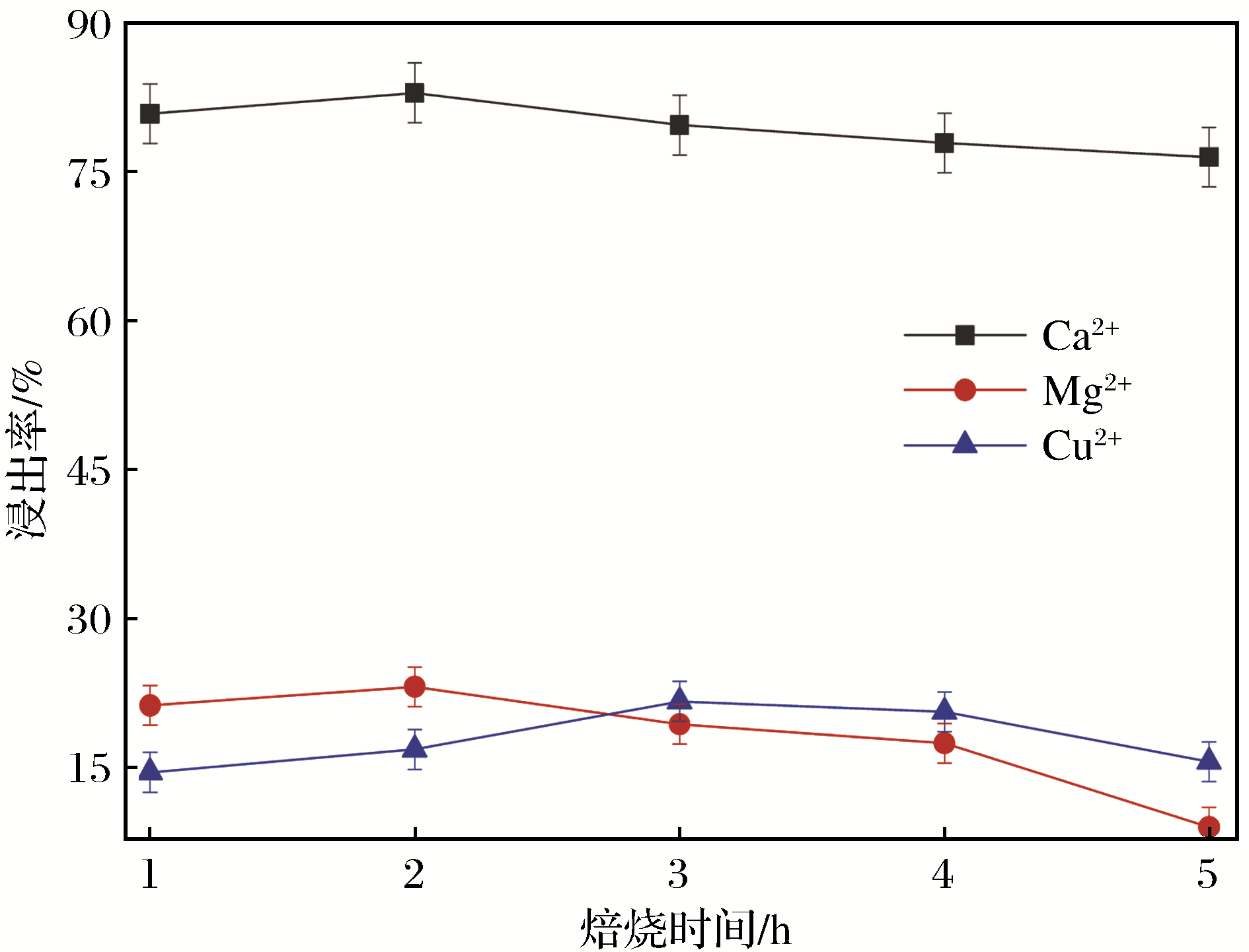 | 图4 焙烧时间对Ca2+、Mg2+和Cu2+浸出效果的影响 |