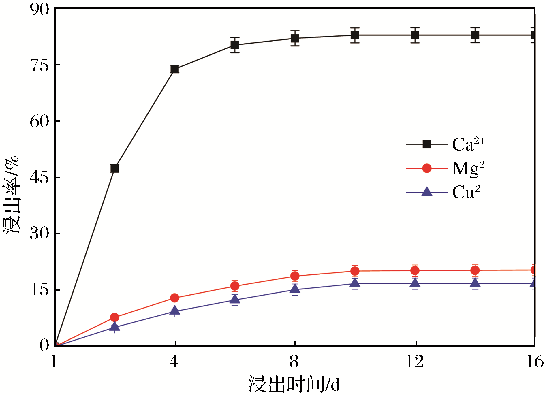 | 图5 浸出时间对Ca2+、Mg2+和Cu2+浸出效果的影响 |