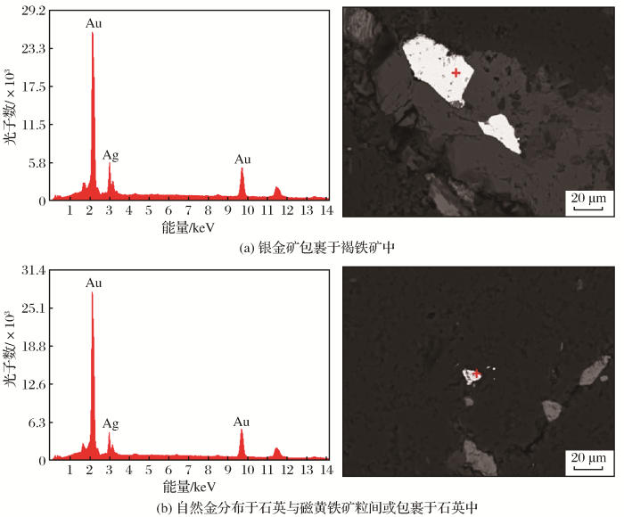 (1)银金矿:区内金主要以银金矿形式赋存,少部分为裸露和半裸露的自然金。裸露和半裸露的自然金多为分布在磁黄铁矿与黄铁矿矿物颗粒间的粒间金,以及分布在石英脉与黄铁矿裂隙间的裂隙金。
