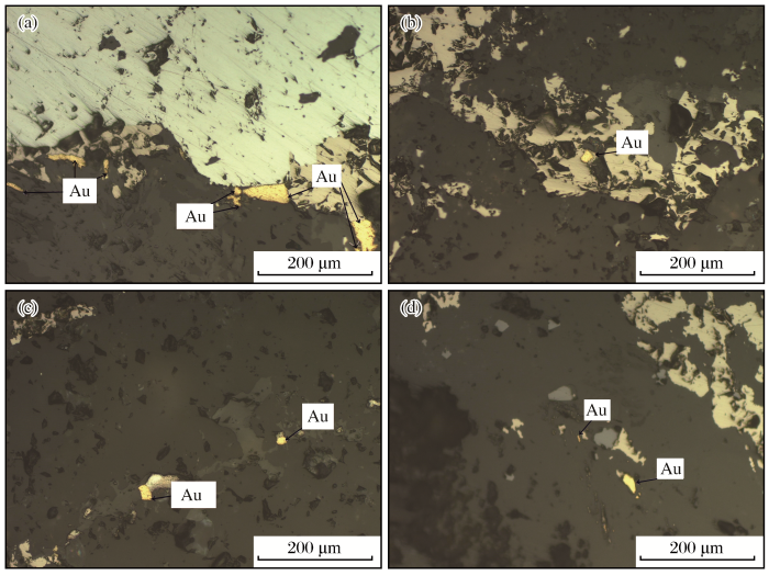 (a)黄铁矿呈浸染状分布(100×反光);(b)磁黄铁矿、毒砂和黄铁矿紧密共生,呈浸染状分布(50×反光);(c)银金矿呈角粒状分布于石英与褐铁矿粒间(200×反光);(d)银金矿呈浑圆状和角粒状包裹于石英中(500×反光)