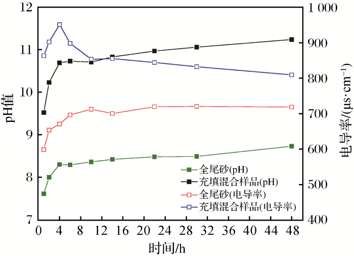 在48 h内分时段取沥滤液测定金矿尾砂与充填料浆的pH值和电导率,测定结果如图3所示。从图中可以看出,加入水泥后充填料浆pH值明显升高且一直呈上升趋势,表明水泥水化过程是逐步进行的。前48 h内充填料浆的电导率相比全尾砂沥滤液的电导率明显升高且在前4 h内呈逐渐上升的趋势,这一现象可能是加入水泥后溶液中OH-和金属离子的增加导致的。但在48 h后,充填混合样品的电导率呈逐步下降的趋势,这反映了溶液中离子的减少。产生这一现象的原因有2个方面:一是某些金属离子与OH-结合产生了沉淀;二是水泥水化产生的C-S-H凝胶吸附固化了大量离子。