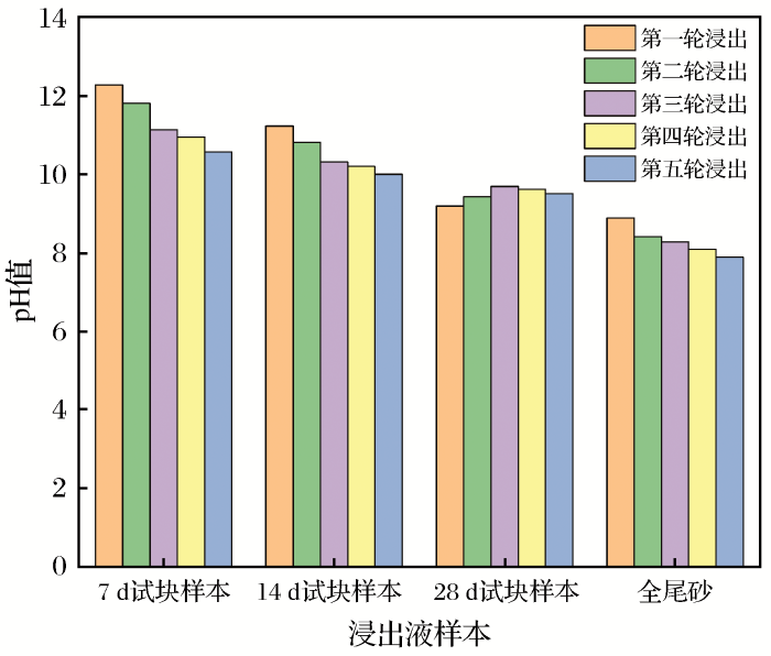 (1)动态浸出后浸出液pH值变化。为了探究充填体充入井下后污染元素的浸出情况,分别对7,14,28 d固化龄期的试块进行5轮动态浸出试验,动态浸出可以模拟自然坏境下的地下渗透条件。