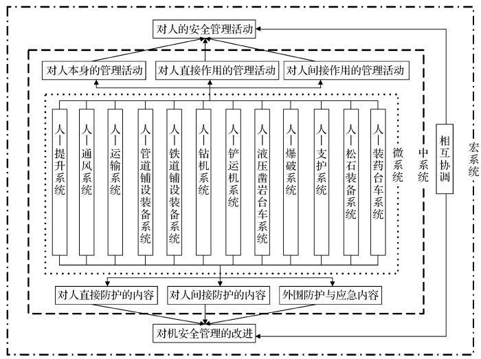 (2)中系统。在对矿山生产划分好微系统的基础上,针对机群,从对人的直接防护、对人的间接防护、外围防护及应急这3个方面进行定期检查;针对人群,从对人本身、对人直接作用和对人间接作用这3个方面进行定期管理,这一层的安全管理称为中系统。