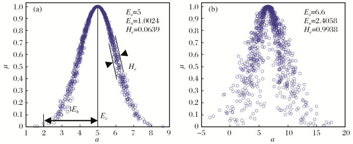 (1)云模型。云模型的概念是李德毅院士等[16 ] 于1995年提出的,是处理定性概念与定量描述的不确定转换模型。该模型已被运用于多个领域[17 ] 。云模型用期望值(E x )、熵(E n )和超熵(H e )这3个数值来表示数字的特征,考虑到了数字的模糊性和不确定性。期望值(E x )表示样本的中心值,熵(E n )是对样本不确定性的度量,超熵(H e )是对熵的不确定性的再描述[18 ] 。