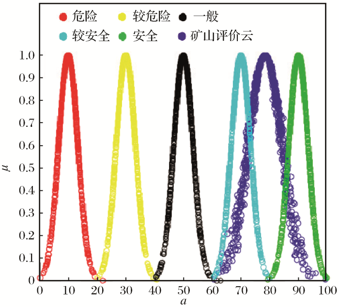按计算参数绘制评价等级云图,如图4 所示。当得到某一时期的矿山安全评价得分为A m = [ 85,75,85,82,70 ] 时,利用式(1)~式(3)计算其云特征参数,将其云图绘制在评价等级云图中,如图4 所示,便能得到一个考虑模糊性与随机性的矿山安全评价结果。