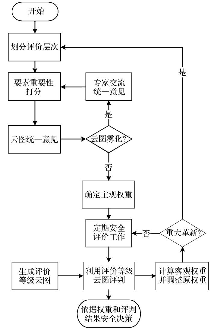 对于矿山的安全评价,已有学者进行了相关研究[8 ,14 ,15 ] ,其中运用人工智能(如B-P神经网络)进行评价的方法需要大量的原始评价数据进行训练,从而保证结果的准确性,因此并不适用于新构建的评价体系。本文耦合云模型、AHP法和CRITIC法,提出了一套结合广义安全模型的安全评价方法。