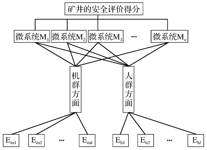 (1)广义安全模型评价层次划分。根据矿井条件及采矿工作,将矿井生产过程中的人群与机群的匹配划分为若干个微系统(M1 ,M2 ,…,Mn )。对于划分好的微系统(M1 ,M2 ,…,Mn ),针对机群,从对人的直接防护、对人的间接防护、外围防护及应急3个方面选取适合要素(Em1 ,Em2 ,…,Em k );针对人群,从对人本身、对人直接作用和对人间接作用3个方面选取适合要素(Eh1 ,Eh2 ,…,Eh l )。得到的评价层次结构图如图6 所示。