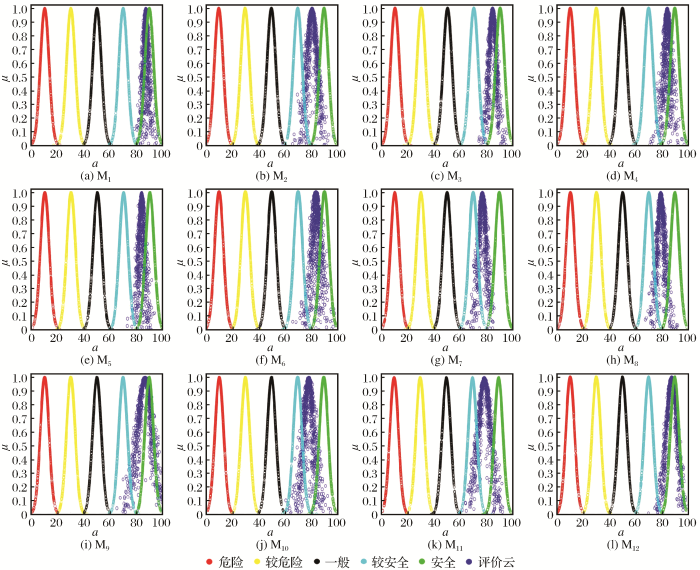 各微系统安全评价等级云如图8 所示。其中,M1 、M3 、M4 、M5 、M6 和M12 微系统的安全状况稳定且波动较小;M2 、M7 和M8 微系统的安全得分波动不大,但其均值偏低,故应采取相应措施改善微系统中的低得分项;M9 微系统的安全得分均值较高,但其安全得分波动较大,故应查找造成这种波动的原因,并加以控制;M10 和M11 微系统不仅安全得分低,而且安全状况波动较大,应着重加以改善。评价结果符合矿井安全状况。