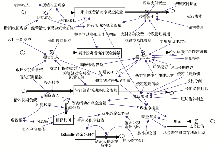 有色金属矿山企业运营系统是一个系统工程,它受到诸如国家政策、地理环境、开采技术、地质储量和市场需求等因素的影响,各因素之间相互关联、相互作用。其中,现金流是企业发展的血液,企业经营活动的基础是充足的现金流量,现金流量也是投资者和债权人密切关注的问题。因此如何控制好矿山企业的风险,保证资金充足,维持现金流动稳定显得尤为重要。目前,有色金属矿山企业一般利用财务管理系统生成财务报表,根据财务指标进行风险管理,尚未开展基于现金流预警仿真的风险管理与控制,因此根据矿产资源开采特点,针对有色金属矿山企业经营、投资和筹资各现金流量问题进行预警研究有着重要意义。