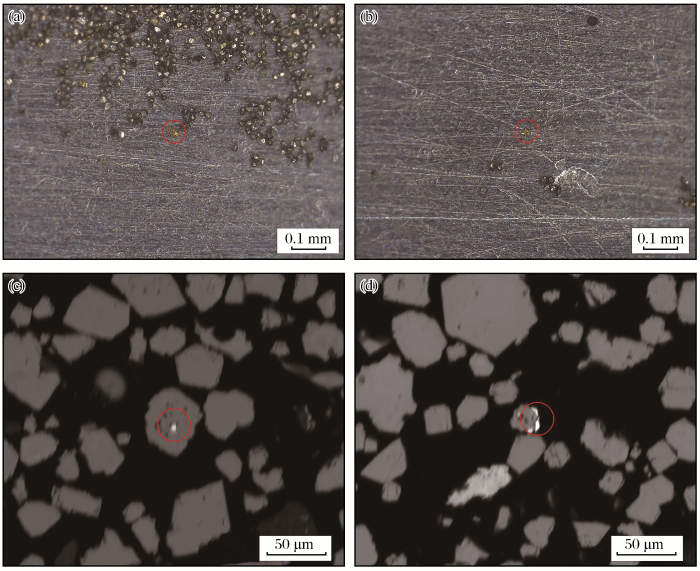 (a),(b)电镜观察到的超级重选机所得重矿物中的单体金;(c)自然金被黄铁矿包裹;(d)自然金分布在黄铁矿颗粒边缘