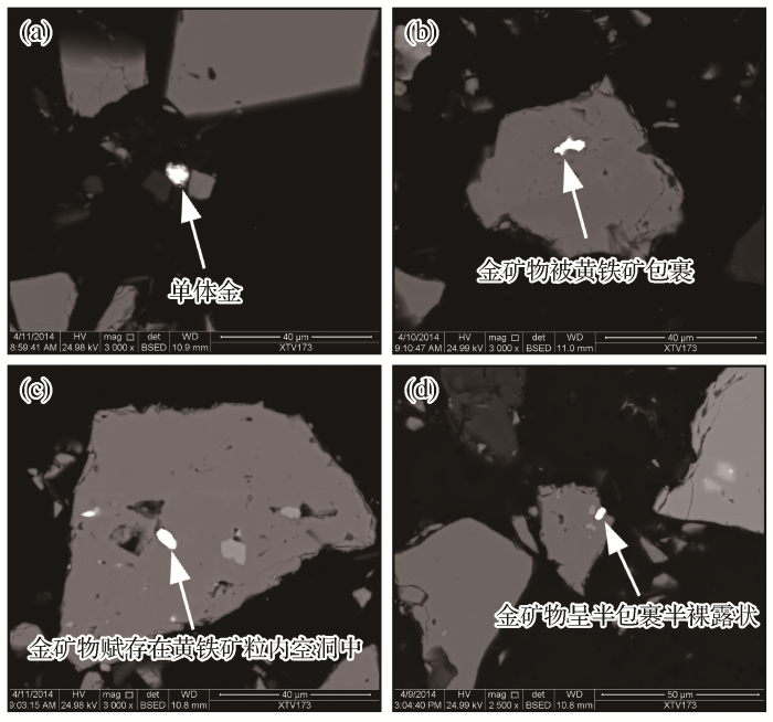 (a)自形黄铁矿与脉石连生;(b)他形黄铁矿与脉石连生;(c)碎屑状黄铁矿与毒砂;(d)黄铁矿与自形毒砂连生