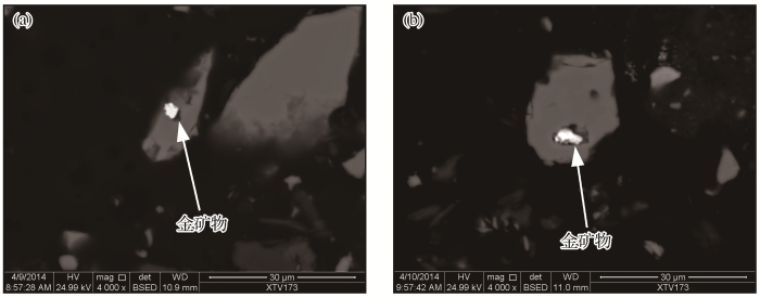 (3)金矿物粒度为1~10 μm,金矿物中Au质量分数为74%~89%,Ag质量分数为9%~23%,金矿物以银金矿为主,存有少量自然金。