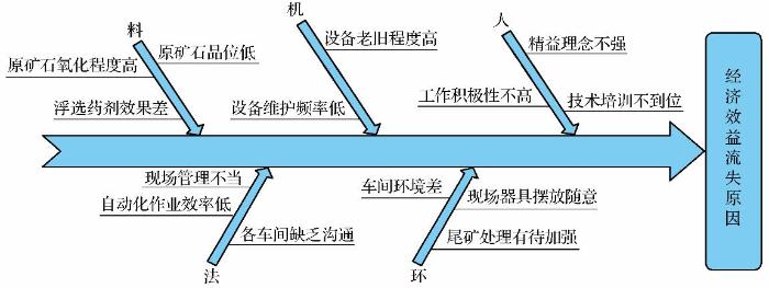 由ISM流程分析可知,影响广西某银矿选矿效益的最主要原因是精益理念不强、现场管理不当和原矿石品位低。