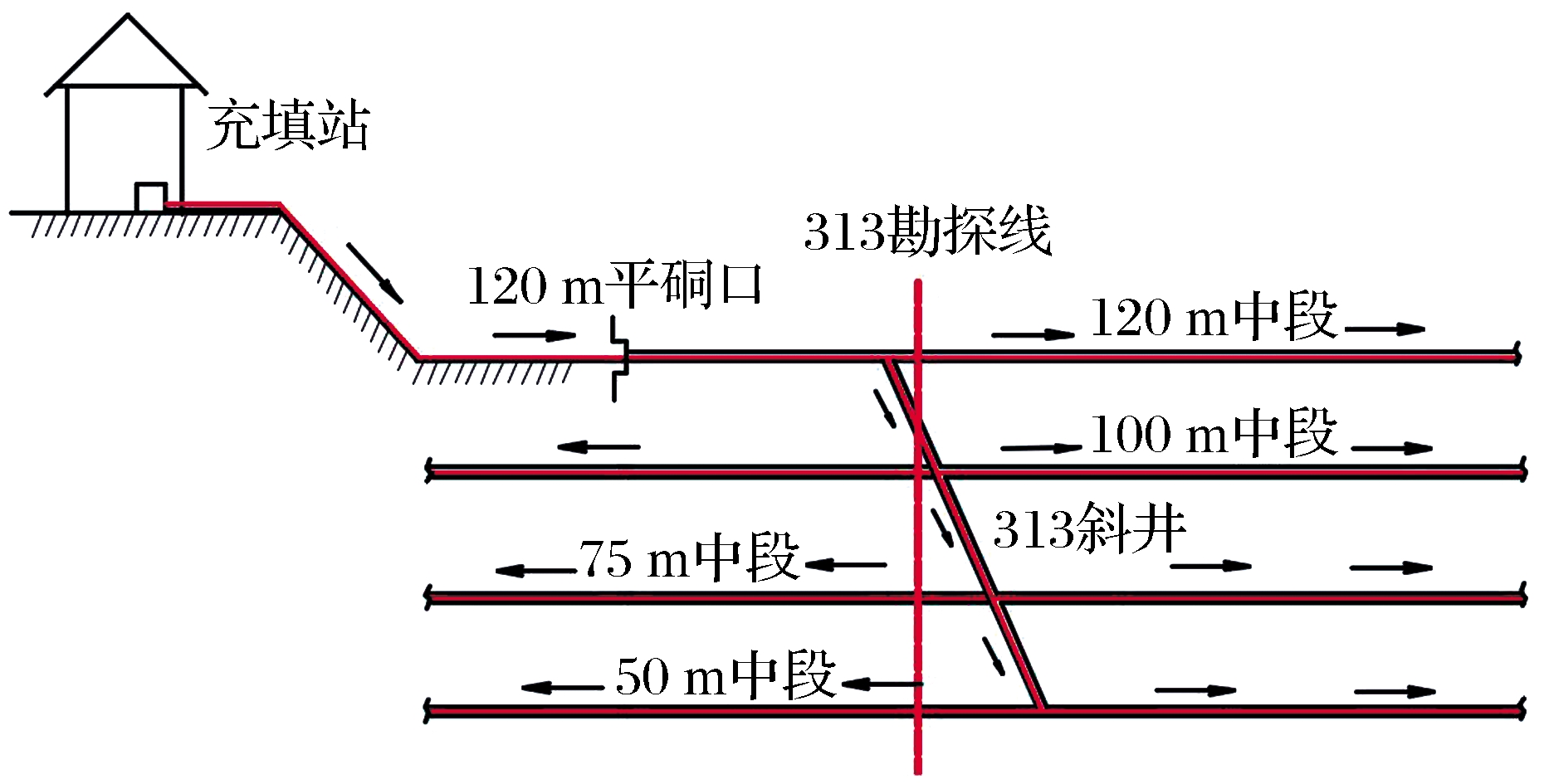 | Fig.2 Transportation plan of filling slurry pipeline in 120 m adit |