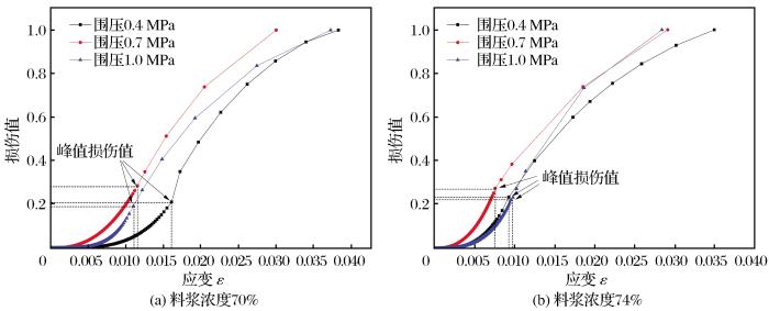 结合表3和单轴压缩试验数据,得出充填体料浆浓度分别为70%和74%时不同围压下的损伤值—应变曲线(图4)。由图4(a)可知,料浆浓度为70%的充填体在围压为0.4,0.7,1.0 MPa时,峰值极限对应的损伤值分别为0.2111、0.2860和0.1920,峰值极限变化呈现先增大后减小的趋势。当围压从0.4 MPa增加至0.7 MPa时,试件的损伤值明显增大,且更先达到峰值极限(峰值应变从0.0160减小至0.0115),峰后损伤增长曲线与围压为0.4 MPa时大致相似。随着围压的继续增大,试样的损伤值降低,且峰值应变大致相同(0.0115和0.0109)。分析峰后曲线走势原因:当料浆浓度为70%时,充填材料内部空隙发育,围压增大,缩短了充填体弹性变形阶段,更早达到屈服极限,并且提高了充填材料自身抵抗破坏的能力,峰值损伤值增大,随着围压继续增大,充填材料横向挤压破坏,此时提前达到屈服极限,损伤值降低。由图4(b)可知,对于料浆浓度为74%的充填体,3种围压的损伤值分别为0.235、0.275和0.233,峰值极限变化同样呈现先增大后减小的趋势。当围压从0.4 MPa增加至0.7 MPa时,峰值极限出现稍早(峰值应变从0.0094减小至0.0078)。之后当围压增大至1 MPa时,峰值损伤值回落,大致等于围压为0.4 MPa时的峰值,但峰后荷载阶段,损伤值逐渐上升,此时不同围压下3组损伤值—应变曲线变化趋势接近。由此可知,当料浆浓度为70%时,增大围压将先促进充填体损伤,之后抑制损伤,但继续增大料浆浓度,充填体强度增加,围压对充填体的影响变小。因此,矿山可根据实际地压选取适宜的料浆浓度。