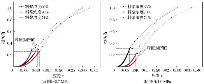 结合表3和试验数据得出围压分别为0.7 MPa和1.0 MPa的条件下不同料浆浓度损伤值—应变曲线(图5)。由图5(a)可知,当围压为0.7 MPa时,充填体在3种料浆浓度下峰值极限对应的损伤值分别为0.303、0.286和0.275,整体呈现依次递减趋势。当料浆浓度从66%增大至70%时,试件损伤值减小,达到峰值极限延迟(峰值应变从0.0101增加至0.0115),在峰后损伤阶段,料浆浓度为70%的充填体损伤值逐渐大于料浆浓度为66%的充填体(峰值应变为0.0176时损伤值相等);随着料浆浓度的继续增加,试样峰值极限对应的损伤值降低,但峰值极限提前(峰值应变从0.0115减小至0.0078),峰后承载阶段,料浆浓度为74%的充填体损伤值一直大于料浆浓度为70%的充填体损伤值,且峰后损伤变化曲线与料浆浓度为66%的充填体近似为平行状态;由图5(b)可知,当围压为1.0 MPa时,不同料浆浓度(66%,70%,74%)的峰值极限对应损伤值分别为0.317、0.192和0.233。损伤值整体下降较大(由0.317下降至0.192和0.233),峰值应变增大(由0.0068增加至0.1090和0.0990);峰后载荷阶段,料浆浓度为70%的充填材料损伤值小于料浆浓度为66%的充填体材料,当料浆浓度为74%时,损伤值逐渐增大,应变为0.0253时,损伤值反超料浆浓度为66%的充填体材料。分析峰后曲线走势原因:当围压为0.7 MPa时,增大料浆浓度提高了充填材料的自身强度,抑制峰前损伤增长,但促进了峰后损伤增长,随着料浆浓度的继续增加,损伤值全面提高;当围压为1.0 MPa时,2次提高料浆浓度使充填材料强度增加,同样抑制峰前损伤率,在围压足够大时限制充填材料的横向破坏,使得峰后阶段损伤率也降低,但当料浆浓度为74%时,损伤值逐渐增大,可见此时料浆浓度增大促进了试件的破坏。因此,在矿山充填治理中,当围压为0.7 MPa时,选择料浆浓度为66%;当围压为1.0 MPa时,选择料浆浓度为70%较适宜(按实际比例参考)。