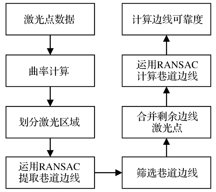 基于RANSAC的巷道边线提取流程如图1所示。首先使用二维单线激光雷达收集激光点云数据,并计算每个激光点的曲率,在曲率超过阈值的点处,将激光点云划分为前、后2个区域;然后运用RANSAC算法从各个区域中提取巷道边线,并且根据铲运机航向角和巷道设计标准对生成的直线进行筛选;最后合并筛选过后的激光数据,再次应用RANSAC算法,生成最终的巷道边线,并从平行度等方面计算巷道边线可靠度。