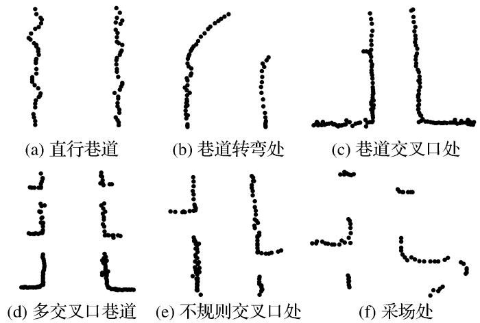 6组数据如图2所示。根据巷道类型可分为3类:数据集(a)和(b)分别是没有交叉口的直行运输巷道和部分弯曲的运输巷道,这是井下环境最简单的场景;数据集(c)、(d)和(e)分别对应有各类交叉口的巷道,情景相对复杂,其中数据集(c)是巷道岔口处,(d)、(e)是多交叉口及不规则交叉口处的巷道,岔口密集,巷道两帮被岔口分为多段短壁,由于短壁之间空隙较多,激光扫描信息反馈缺失严重;数据集(f)是采掘工作面附近的巷道场景,有很多不规则的几何结构,必须结合巷道设计准则和铲运机的航向角等信息才能提取出巷道边线。