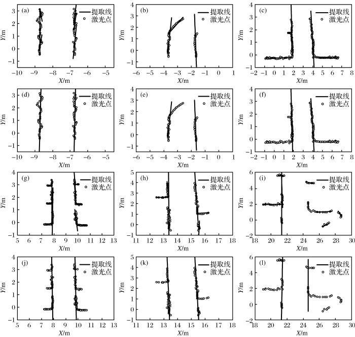 以图2中数据集(d)为例进行分析。该数据集显示的是井下常见的巷道交叉口场景,巷道两帮是多段短壁,通过计算激光点的曲率,巷道两帮的激光点云各被划分为6个区域,然后分别运用RANSAC算法进行直线提取共产生12条直线。根据铲运机的航向角和巷道的设计标准对直线进行筛选,当前铲运机的航向角