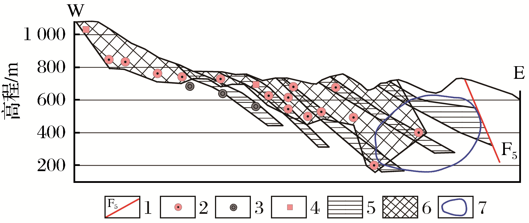 | 图9 Ⅰ号矿体垂直纵投影图 1.断层;2.见矿钻孔;3.未见矿钻孔;4.平硐;5.IP高激化体;6.金矿体;7.预测靶区 |