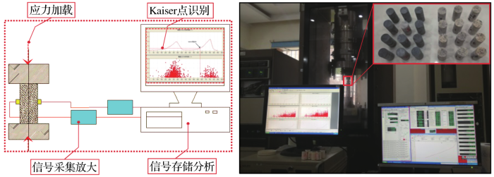 ... 声发射试验图如图4 所示,利用岩石材料的Kaiser效应[10 ,21 ] ,使用MTS815材料试验机和PCI-2声发射测试系统对加工好的地应力测试岩样进行单轴压缩的声发射试验.测试系统自动记录岩石的声发射幅值和绝对能量等数据,通过加卸载以及二次加载对声发射累计计数和绝对能量进行统计,结合二次加载的Felicity效应来判断岩石的Kaiser点.对应相应的应力曲线,得到岩样的Kaiser点对应的应力值.通过4个方向的应力值,结合公式计算出地应力大小和方向. ...