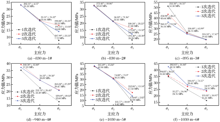 对图5 各测点在应力解除法计算过程中的迭代变化,可以看出-830 m-1#、-830 m-2#和-895 m -3#这3个测点通过2次迭代计算后,先优化了最大主应力σ 1 和中间主应力σ 2 ,第3次迭代计算优化最小主应力σ 3 ;-940 m-4#、-1030 m-5#和-1030 m-6#在2次迭代计算后,先优化了中间主应力σ 2 和最小主应力σ 3 ,第三次迭代后进一步优化了最大主应力σ 1 。