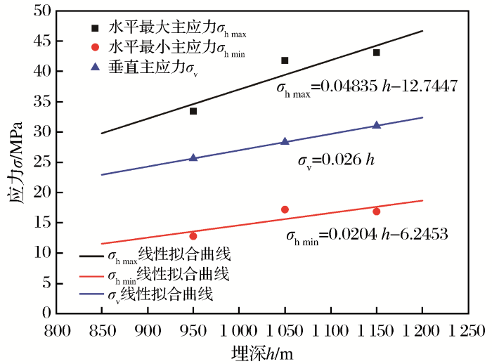 通过对水平最大主应力σ h max 、水平最小主应力σ h min 和垂直主应力σ v 与埋藏深度h 的关系进行曲线拟合,得到线性拟合曲线(图7 )及回归方程(22)。