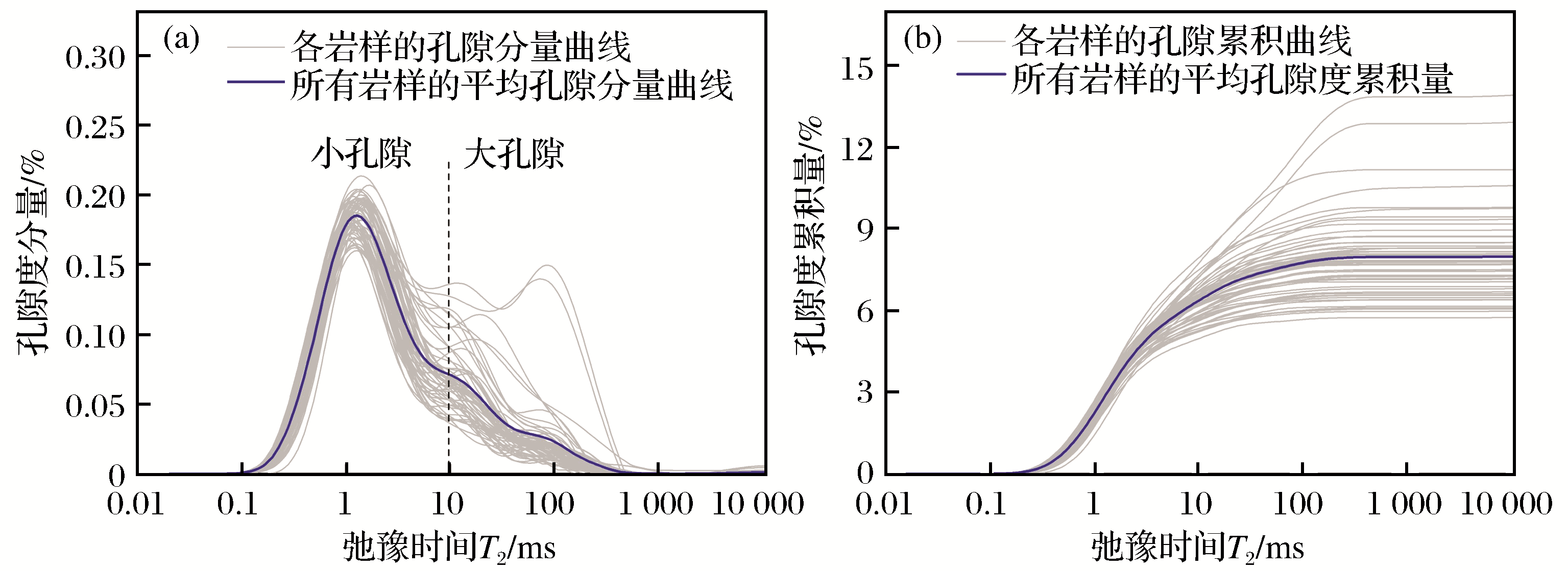 | 图4 所有试样核磁共振图谱 (a)试样T2谱分布曲线; (b)试样孔隙度的累积曲线 |
