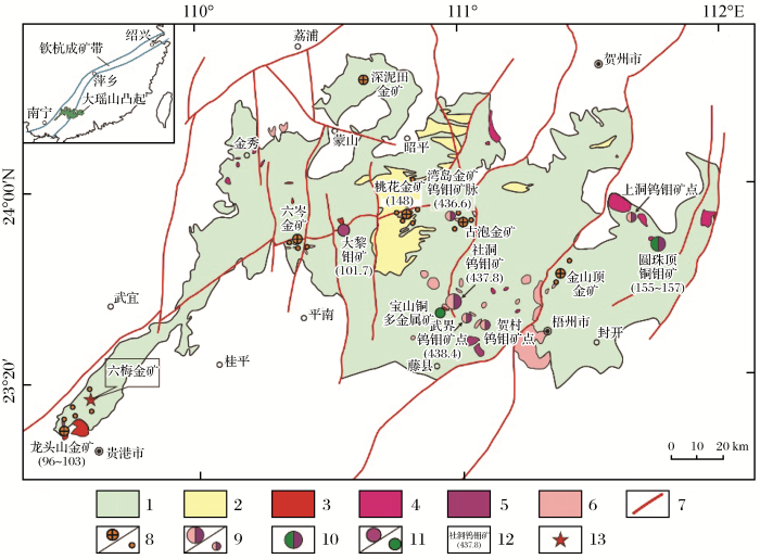 大瑶山隆起区位于广西的中东部,面积接近18 000 km2。该区北起蒙山—昭平—贺州,南至桂平—平南—滕县—梧州,西至金秀—贵港一线,东达两广边界的连山—封开一带,大地构造位置处于扬子古板块与华夏古板块的结合带[1,7]。前人将其划归为钦杭成矿带的南西段[8-9],由于大瑶山地区岩浆活动频繁,伴随岩浆活动产生了一系列的多金属矿化(图1)。六梅金矿所在的大瑶山鼻状突出部位,目前已发现大量矿床(点)(图2)。大平天山地区地层主要为寒武系和泥盆系,二者呈角度不整合接触。寒武系以一套砂泥岩夹层的浊积碎屑岩为主,局部夹灰岩,加里东运动形成褶皱基底;泥盆系以一套砾岩、砂岩和灰岩为主,不整合覆盖在寒武系之上。第四系出露在区域的南部(图2)。