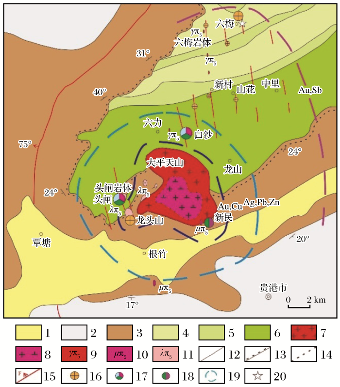 区内燕山期岩浆活动强烈,主要为大平天山花岗闪长岩—黑云母花岗岩复式岩体和龙头山次火山岩体,前者呈岩株状产出。此外,区内还有一些花岗斑岩和流纹斑岩脉沿NNW向断裂充填,主要分布在大平天山岩体西部的头闸、北部的白沙,以及东北部的六梅一带(图2)。