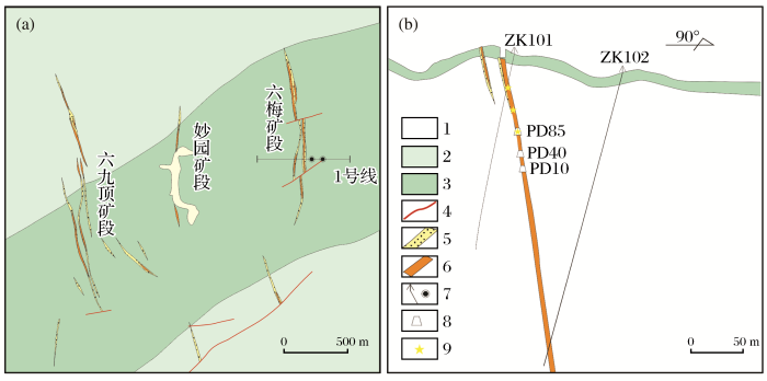 1.第四系;2.寒武系黄洞口组上段;3.寒武系黄洞口组中段;4.断层;5.蚀变带;6.矿体;7.钻孔;8.沿脉坑道;9.采样位置