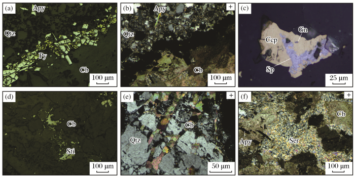 (a)毒砂—黄铁矿脉(反射光); (b)毒砂—黄铁矿脉(正交偏光);(c)方铅矿、闪锌矿与黄铜矿共生(反射光);(d)铁白云石中的辉锑矿(反射光);(e)Ⅳ阶段铁白云石切割早期石英脉(正交偏光);(f)绢云母化(正交偏光)Apy-毒砂;Ccp-黄铜矿;Cb-铁白云石;Gn-方铅矿;Py-黄铁矿;Sp-闪锌矿;Sti-辉锑矿;Ser-绢云母;Qtz-石英