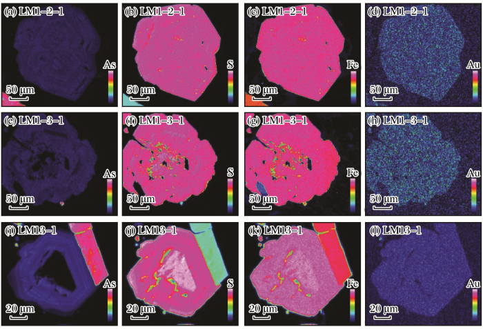 此次用于EPMA分析的9件矿石样品全部采自于矿区170中段、130中段及85中段的坑道内。主要测试矿物为毒砂、黄铁矿及少量辉锑矿。具体测点位置见图7。EPMA测试在中国地质科学院矿产资源研究所进行,测试仪器型号为JEOL JXA-8800R。点分析时采用20 kV电压、20 nA电流、直径1 μm束斑进行测试。面分析分别对矿物集合体进行Au、As、Fe、S元素的扫面。