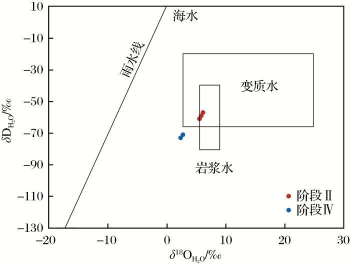 Ⅱ阶段5件黄铁矿样品的δ34SV-CDT值变化范围为-0.8‰~0.5‰,极差为1.3‰,均值为-0.16‰;Ⅱ阶段7件毒砂样品的δ34SV-CDT值变化范围为-0.2‰~0.3‰,极差为0.5‰,均值为0.07‰。