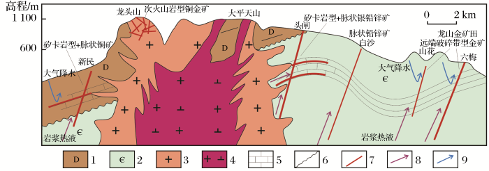 1.泥盆系;2.寒武系;3.晚燕山期花岗岩;4.晚燕山期花岗闪长岩;5.灰岩;6.地层不整合界限;7.矿体;8.岩浆流体;9.大气降水