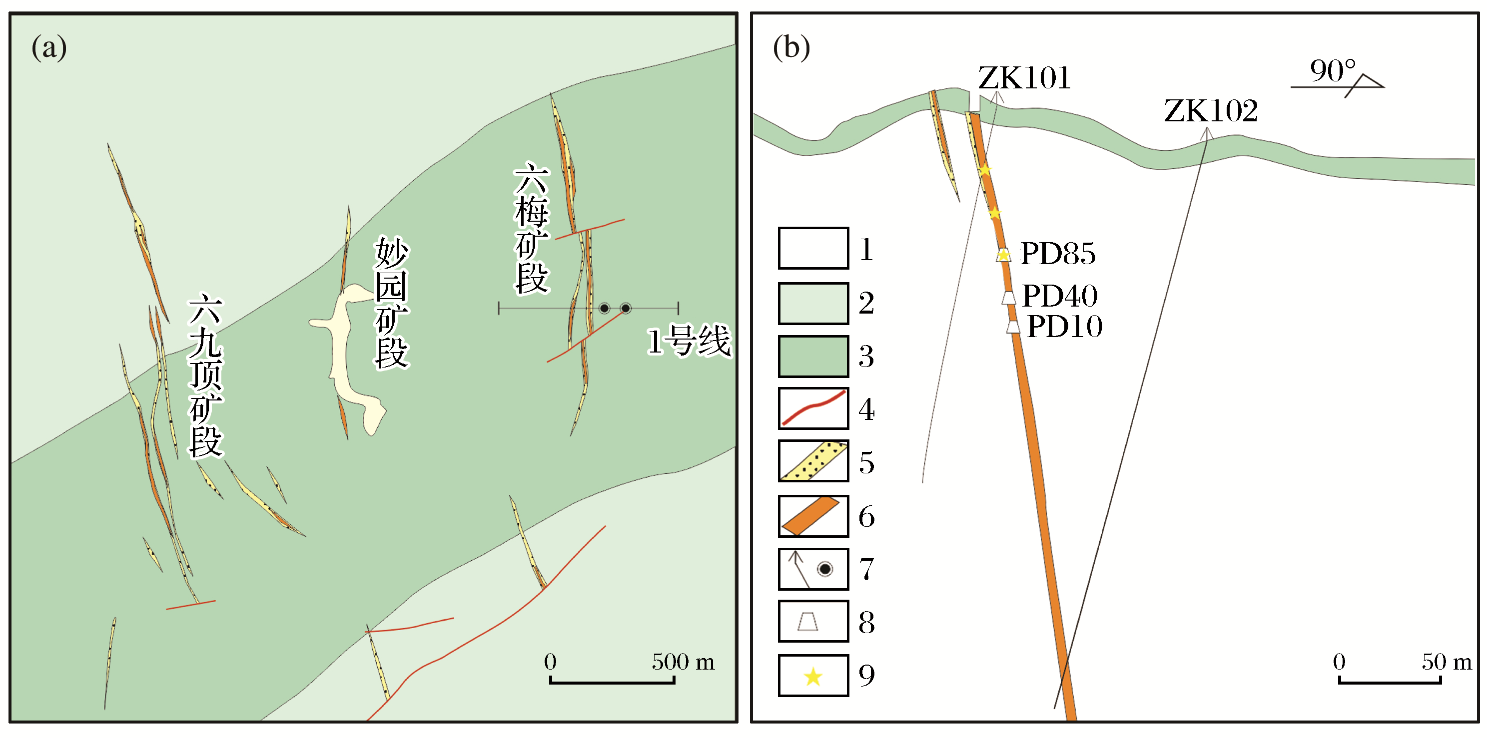 | 图3 六梅金矿区地质简图(a)及1号勘探线剖面图(b)(据广西地矿资源勘查开发有限责任公司修改,2007) 1.第四系;2.寒武系黄洞口组上段;3.寒武系黄洞口组中段;4.断层;5.蚀变带;6.矿体;7.钻孔;8.沿脉坑道;9.采样位置 |